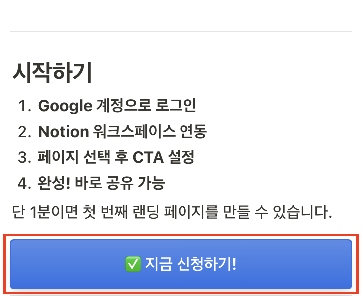 CTA 문구: 랜딩 방문자가 버튼을 클릭하도록 눈길이 가는 문구를 작성합니다. 이모지를 추가하면 더 눈길이 가는 문구가 완성됩니다. 예시: ✅ 지금 신청하기, 👀 자세히보기